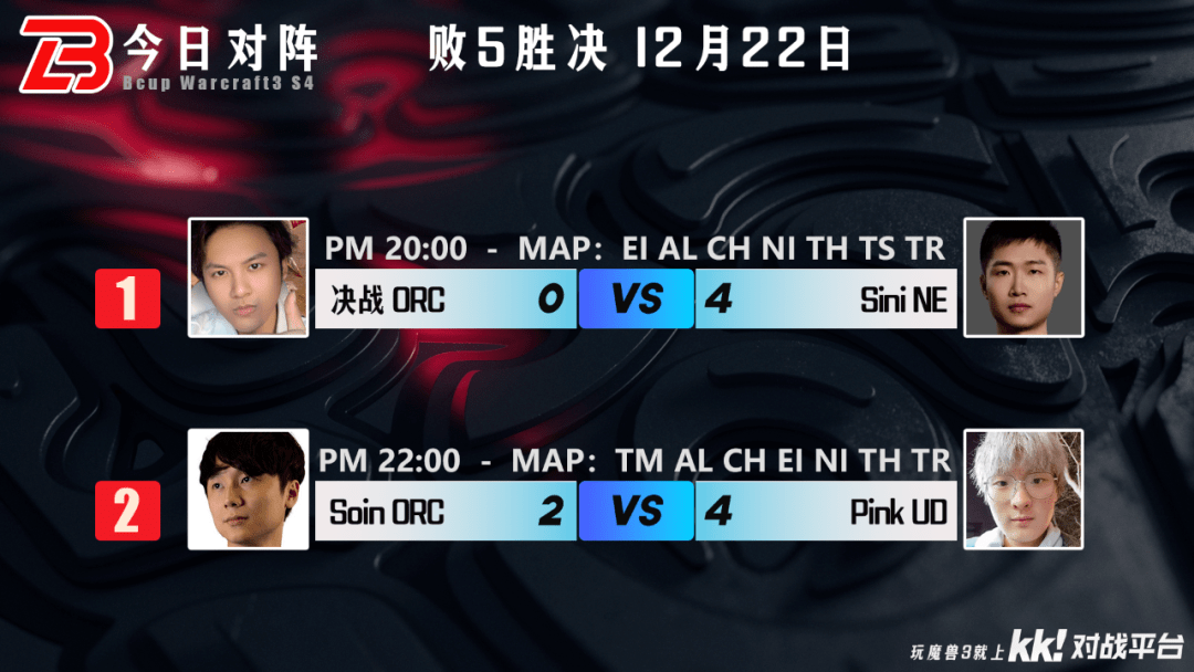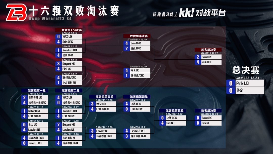 由知名电竞解说BBC主办的Bcup魔兽争霸赛S4(比赛直播间:抖音搜索bbc张宏圣)于12月22日结束了淘汰赛倒数第二个比赛日的争夺,最终00后亡灵小将Pink以4-2击败韩国兽人Soin获得胜者组冠军,而前一天刚刚零封FoCuS的Xiaokk则0-4惨败于Sini惨遭淘汰。