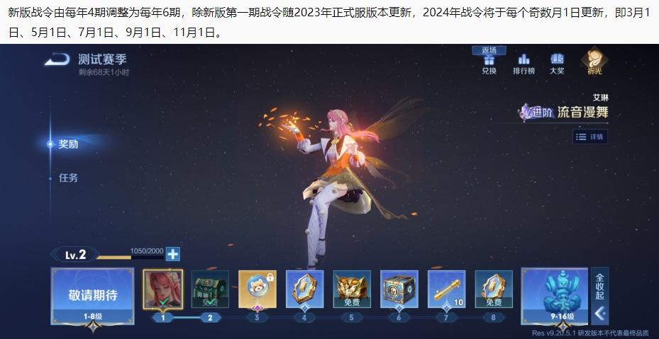 由于战令时长缩短了一个月,战令等级、奖励和任务也有较大调整,进阶版55级战令即可获得两款战令皮肤,而战令星元则更改为典藏版战令奖励。免费版战令也有重大升级,之前的一些小奖励整合为资源自选包,在2级和49级分别有一个英雄自选包,而在65级有一个皮肤自选包。
