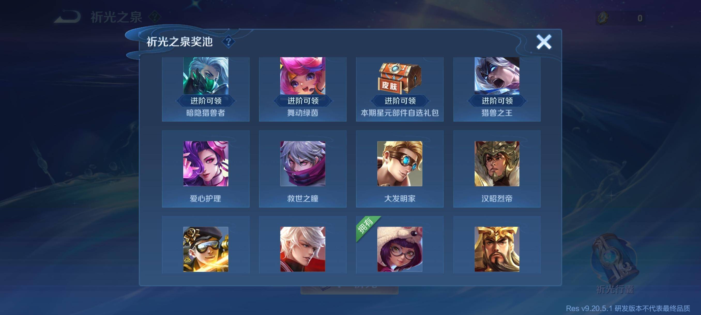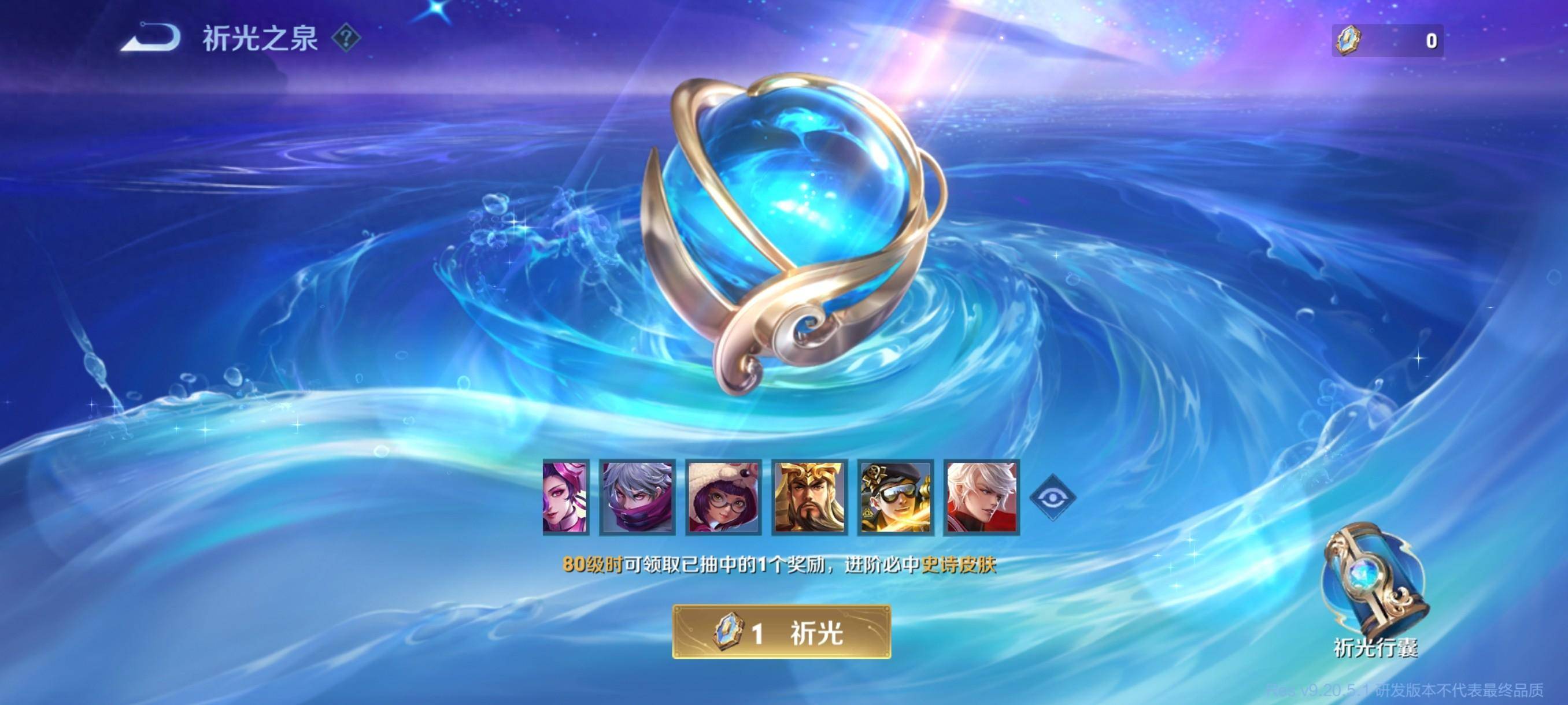 另外,战令中还新增了一个免费的祈光抽奖系统,大部分奖励都是永久皮肤,80级必得一款永久皮肤(自选抽到的奖励),免费版为勇者或伴生品质,精英版和典藏版为史诗品质。