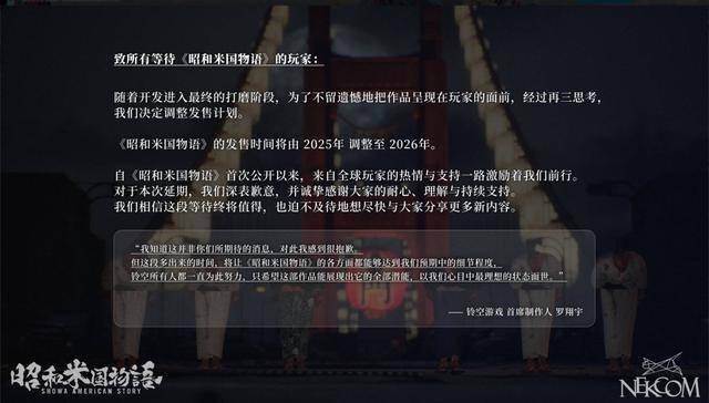 铃空游戏今晚宣布,其开发的动作游戏《昭和米国物语》跳票到2026年发售。官方解释说,目前本作的各方面都没有达到预期中的细节程度,因此为了不留遗憾地把作品呈现在玩家面前,经过三思,决定将发售时间从2025年调整至2026年。