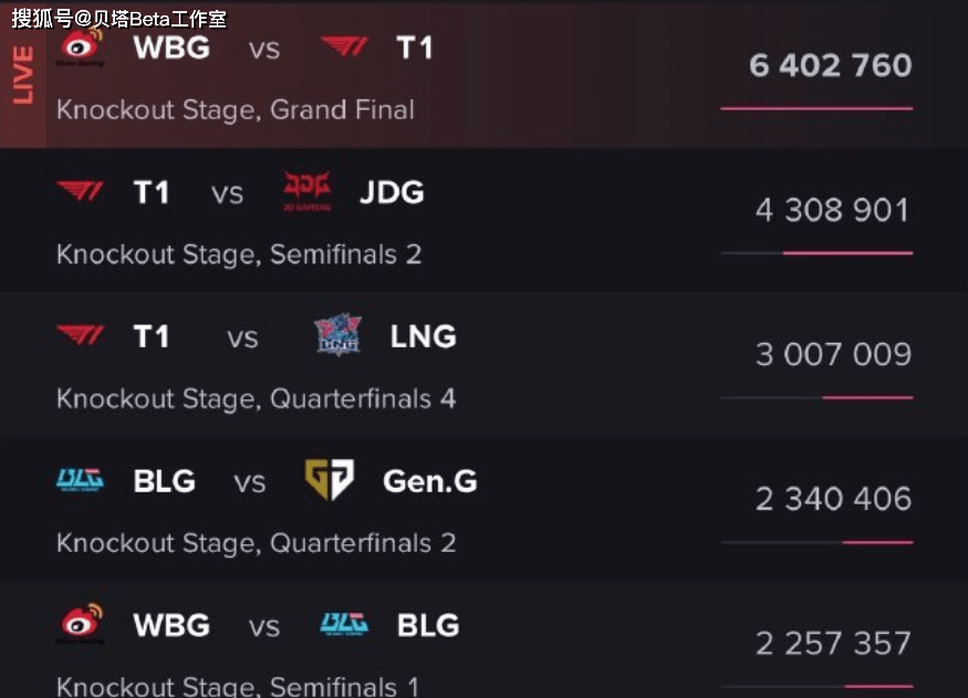 根据海外媒体的统计,这场WBG和T1的比赛,最高峰时有超过640万的观众在收看(不统计中国地区的收视),远远超出第二名T1和JDG的比赛,再次创造收视纪录。其实也可以理解,一方面是T1本身在海外人气就很高,另一方面T1再次夺冠,Faker拿到职业生涯第4冠,这个影响力实在是太大了。