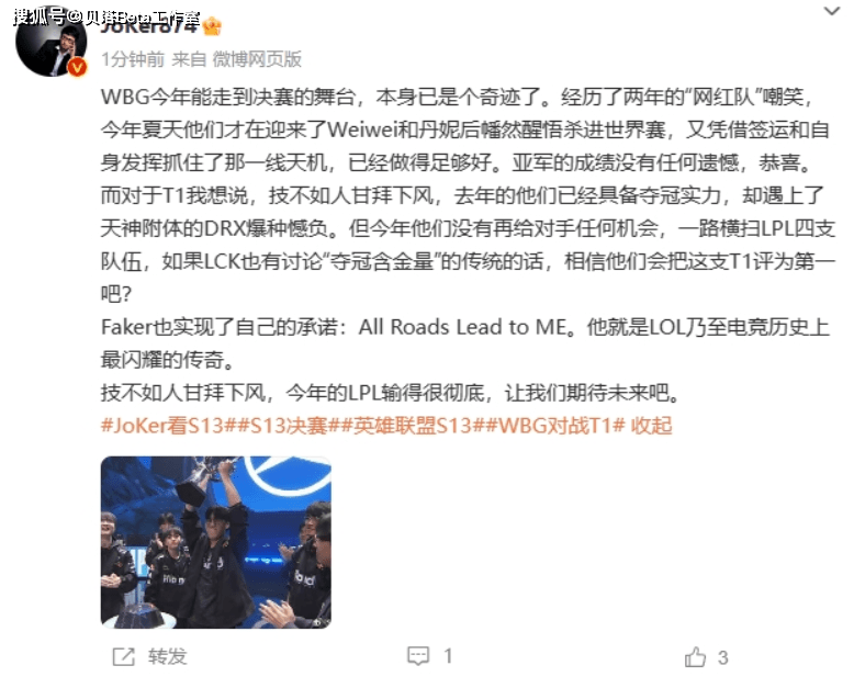 赛后前LPL解说Joker也发文直言:WBG能够走到这里已经是奇迹了,亚军这个成绩没有任何遗憾,输给T1是技不如人甘拜下风。今年LPL输得很彻底,期待未来吧。