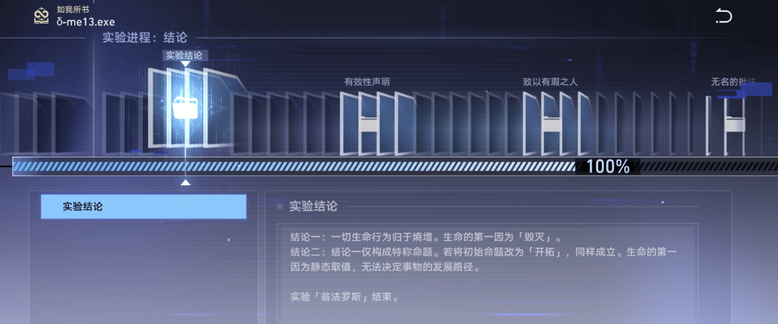 在如我所书的结尾,也如上述理解的那样,先是得出“生命第一因是毁灭”的结论,结论二又叫停翁法罗斯的实验,得出毁灭并非唯一答案的结论,随后经过学习,成为昔涟的徳谬歌和大黑塔的对话,也揭示了结论二的答案。