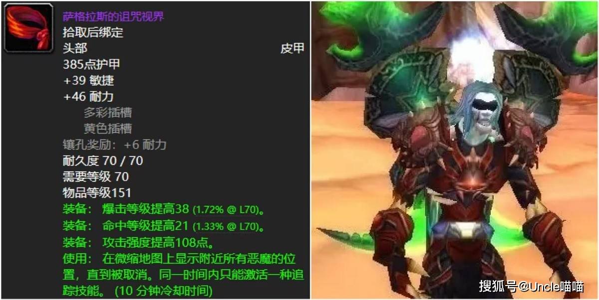 今日份最后的席位喵叔给到的是眼罩,这东西传奇的地方就很简单粗暴了,瞎子伊利丹同款饰物,无数Cosplay玩家的必备之品,当然其实力也绝对是天花板级别的,无论盗贼亦或者还说是狂暴战拿了都嘎嘎好使,那么最后的灵魂拷问给到各位大兄弟,在你心目中伊利丹掉落中最传奇的紫装又是哪一款呢?我们评论区见!