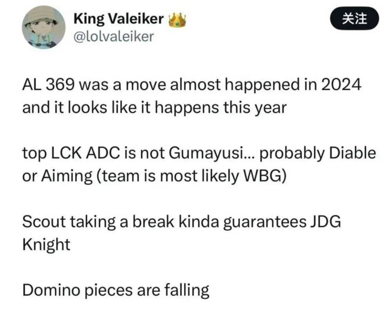 但今天关于AL有两个坏消息,第一个消息就是369选手,可能会来AL,而AL本来的上单圣枪哥会去TES。