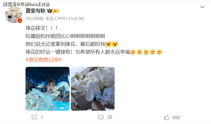 最后新娘的捧花给到了LPL主持人夏安,而且是专门指定要给她的,夏安也在微博晒出了这份好运,送出了祝福。