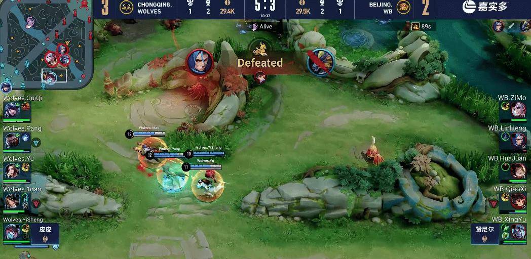 15-19分钟:WB入侵狼队红区被防守,妖刀马可波罗找准时机直接大招加晕眩转残了WB野射,在野射战力受损的情况下WB团战大败并被一波了。