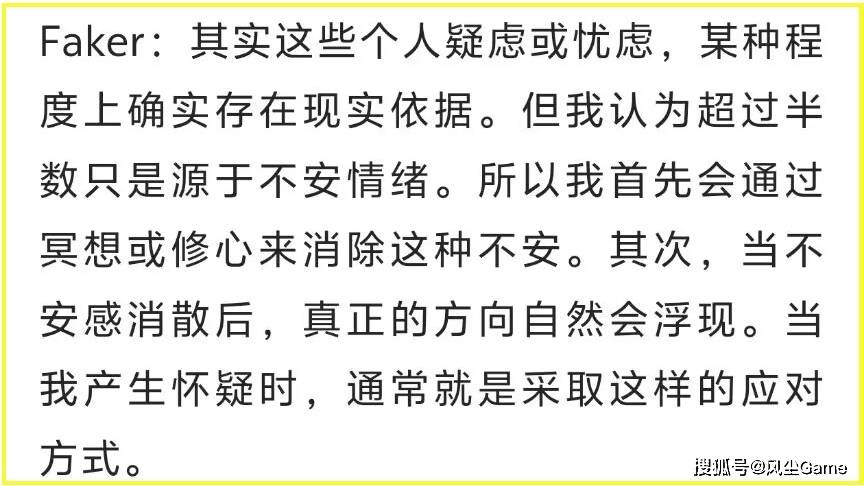 Faker很平淡的说了句:反正就是赢了,除此之外,老李还接受了专访,在采访里,老李回应了,打比赛经常冥想的问题,李老头表示:冥想是为了消除不安,产生怀疑的时候,自己就会冥想一下,不安感消散之后,真正的方向自然会浮现,不愧是爱读书的人,现在说话都一套一套的了。