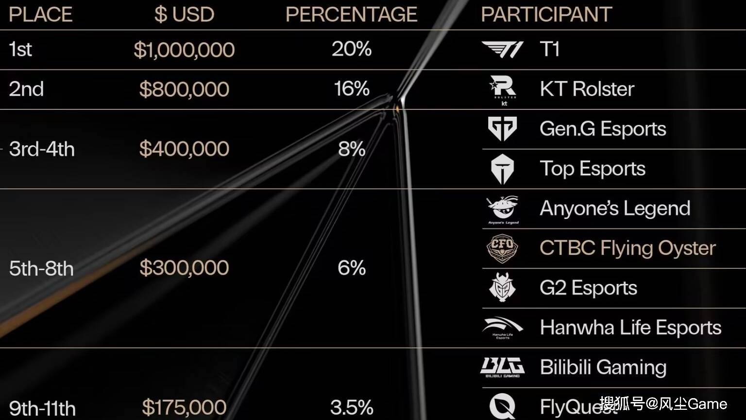 拳头官方在近日,正式公布了2025年,LOL全球总决赛,参赛战队奖金分配情况,拿到冠军的T1战队,独享100万美刀(后面都是刀)),亚军KT是80万,四强的滔搏和GEN,各自拿到了40万,而止步八强的G2、AL、HLE、CFO是30万,第9-11名的BLG、FLY、MKOI,三队都是17.5万。