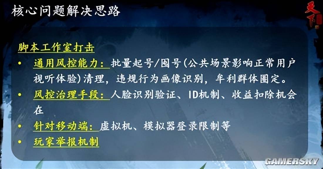 除了采用了从梦幻、大话等头部产品一路积累下来的,相对完整的治理手段外。《天下贰经典版》还在网易内部找来了与专业的技术部门合作,针对异常批量起号的行为进行智能识别与和画像圈定。而《经典版》基于移动端,也严格限制了虚拟机与模拟器登录,并引入人脸识别等手段加强风险监控。