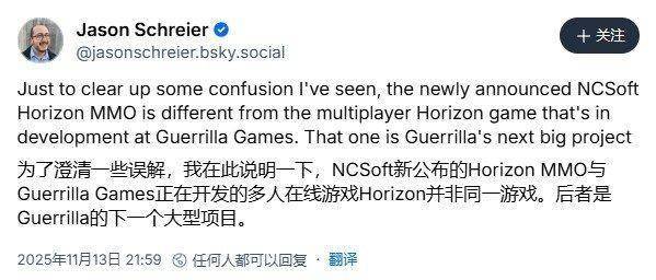 “为澄清某些误解,”施赖尔在社交平台发文称,“新公布的NCSoft《地平线》MMO与Guerilla工作室正在开发的《地平线》多人游戏并非同一项目。后者才是Guerilla的下一部核心作品。”