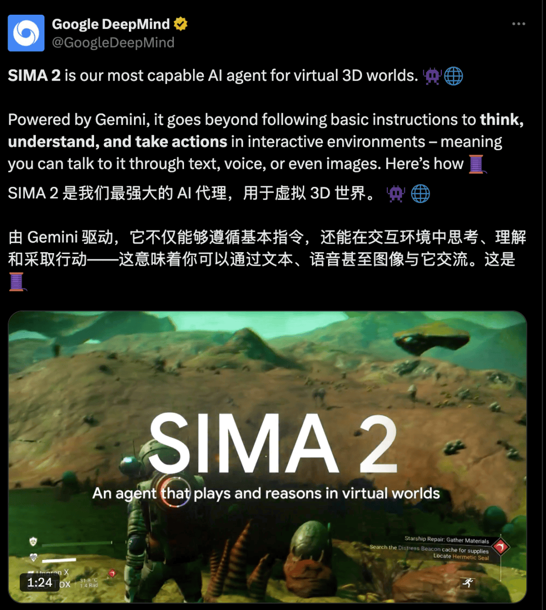 除了字节,谷歌等公司也都在使用游戏场景训练Agent,比如他们最新推出的SIMA 2——一个能够在《模拟山羊3》等虚拟游戏场景中遵循基本指令的通用型AI。