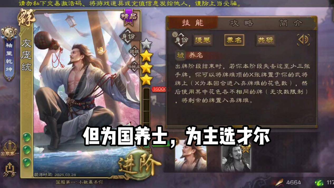 友庞统的二技能为【养名】,效果是庞统出牌结束后,如果失去了至少三张手牌,那么庞统可以将出牌堆顶的若干张牌。单看这个技能,是比较难以触发的,友庞统本身不具有额外摸牌的能力,一回合使用三张牌是比较难以达成的,这样看来【养名】似乎只是一个观赏技。实际上,将庞统的两个技能结合起来,才是友庞统的正确打开方式。