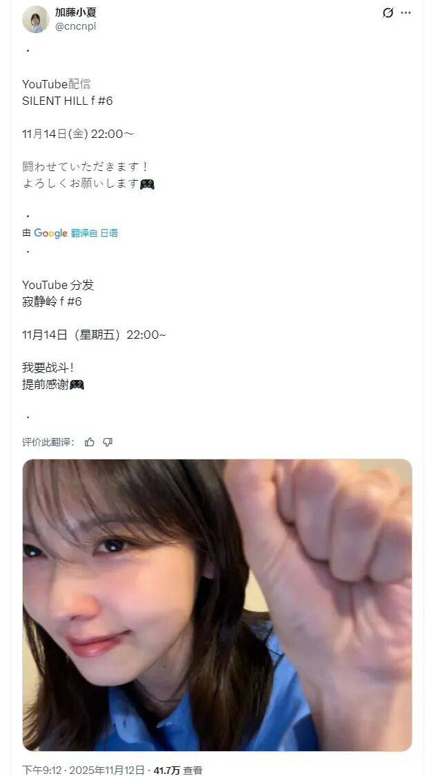 有第一次就有第二次,直播打游戏这种事情怎么都得直播到通关才算完事儿。11月12日,我们的知名先天直播圣体加藤小夏小姐,宣布她将在11月14日晚上20:00(日本时间)降临她忠实的YouTube,继续她的恐怖游戏受难之旅。