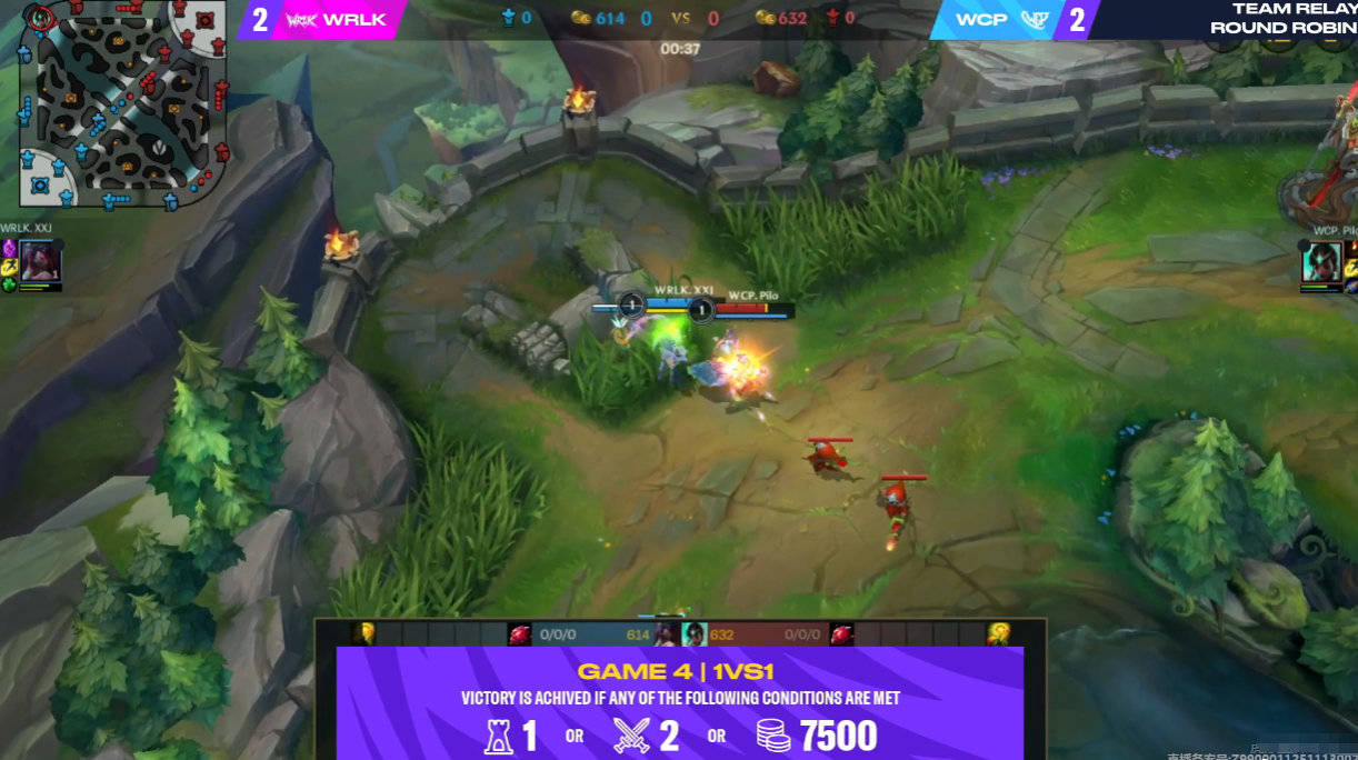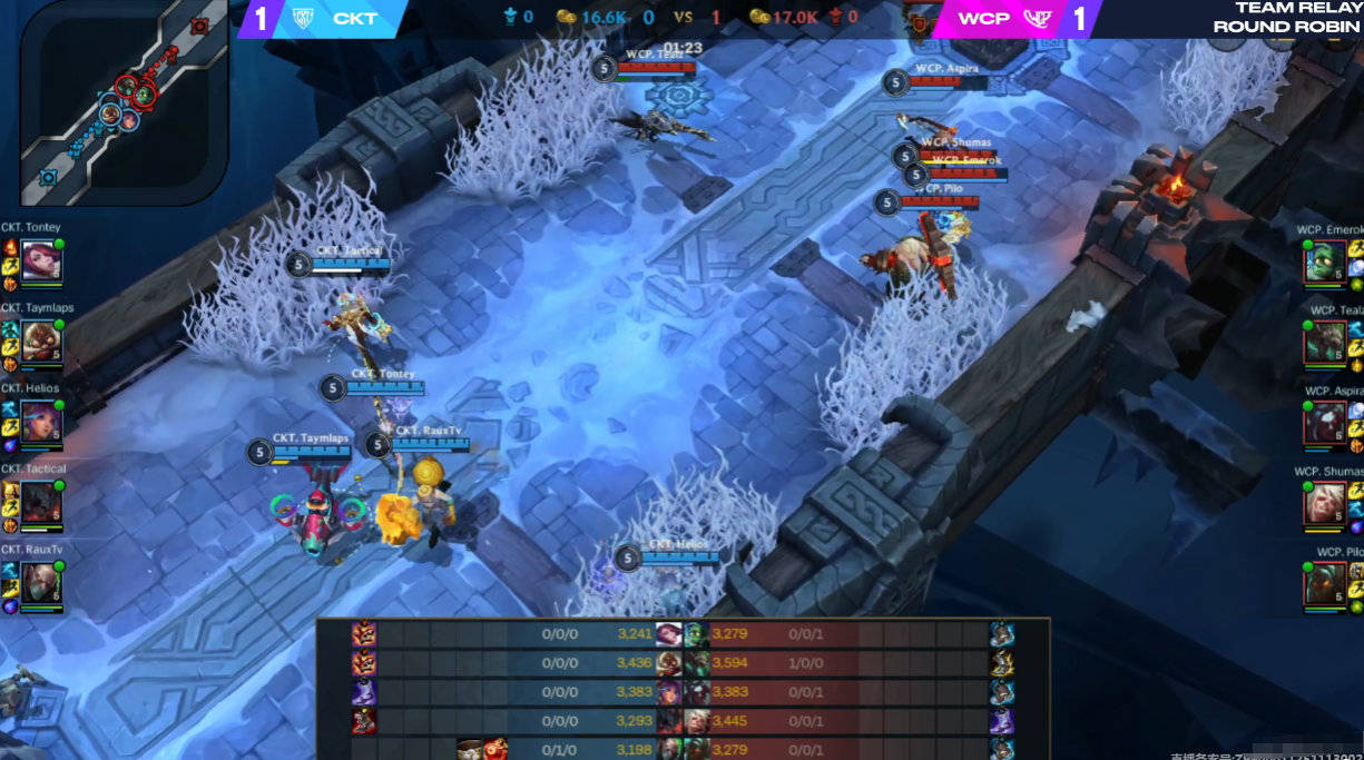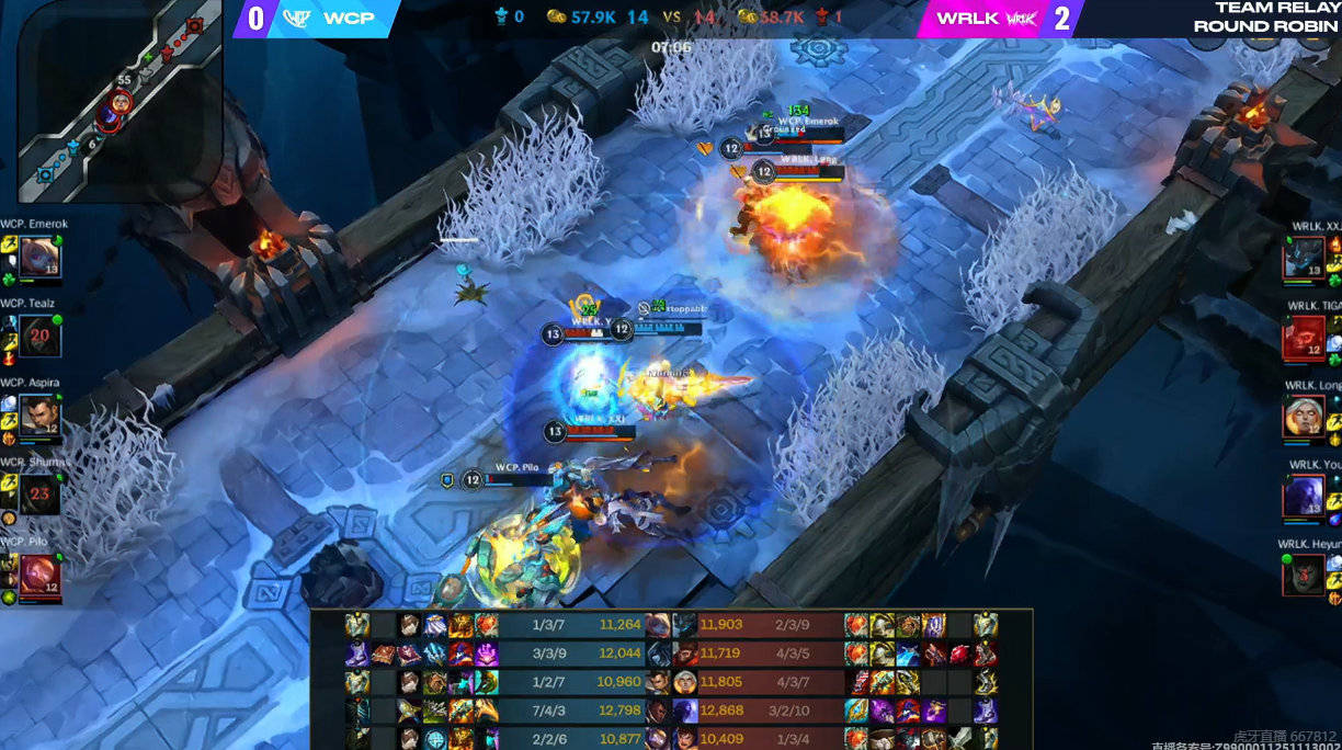比赛开始,双方就将“打架”进行到底。双方你来我往,一直到比赛时间10分钟左右,双方“人头数”与经济都是相当接近。虽然比赛来到后期,拥有天使的WRLK看起来更有优势,但是WCP这边的机器人在关键团战中钩到天使,一锤定音。WCP则是在符文大乱斗中拿下一场胜利。