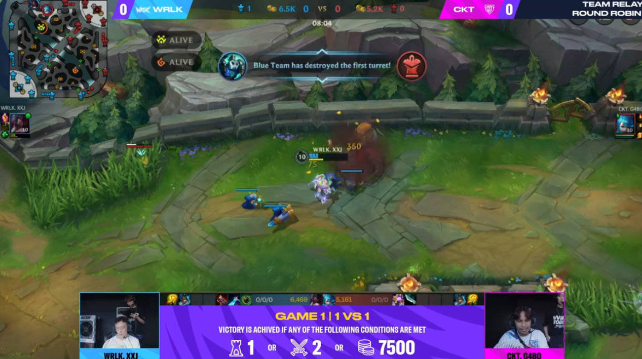 第一局比赛,CKT派出了G4BO选手,WRLK则是派出了XXJ。他们分别拿出了格温与阿卡丽。选出这两个英雄,自然是冲着“击杀”去的。不过,G4BO选手打的非常谨慎,并没有给到XXJ“击杀”的机会。在这样的情况下,XXJ并不着急,凭借着自己扎实的基本功,在经济上始终处于领先。在经济领先的情况下,XXJ多次凭借着阿卡丽精彩的操作经常把G4BO选手的格温打回家。最终,因为多次回城,XXJ轻松拆掉了一塔,为WRLK拿下了第一局比赛的胜利。