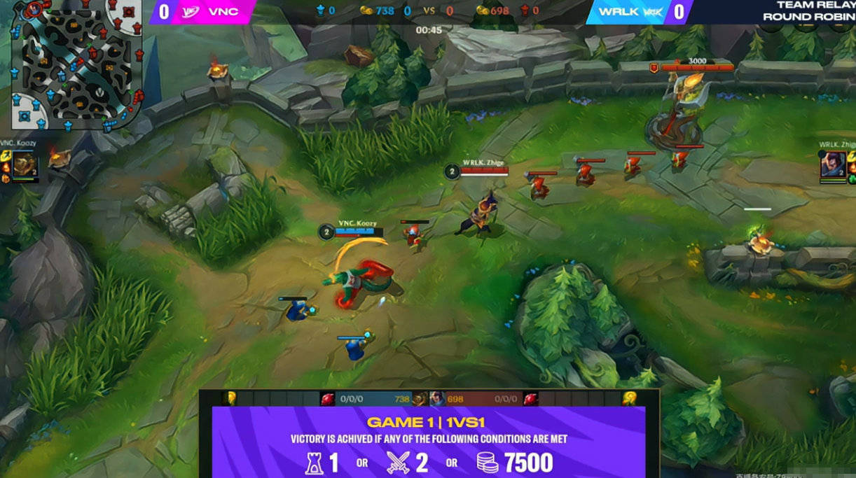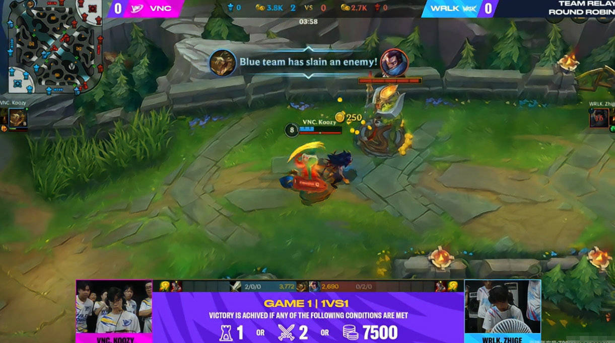 这一天的最后一场比赛是VNC对阵WRLK。在SOLO赛第一局,VNC派出了Koozy,WRLK则派出了Zhige。双方分别选出了鳄鱼与亚索。比赛刚开始没多久,双方就爆发了一波打到底的对决。凭借着鳄鱼前期的优势,Koozy成功拿到了“一血”。在鳄鱼拿到“一血”后,本就在英雄方面处于劣势的Zhig基本只能处于防守姿态。最终,WRLK在经济与等级的优势下,越塔“击杀”了Zhige的亚索,帮助队伍拿下第一局比赛的胜利。