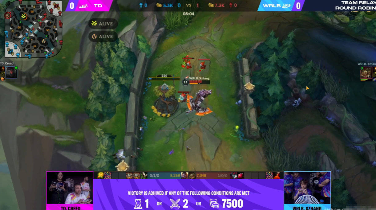 SOLO赛中,TD派出了Creed,而WRLB这边则是派出了Xzhang,Creed选择了杰斯,Xzhang则是选出了自己的招牌鳄鱼。从对线情况来看,可以明显感受到中国的选手在对线方面细节把控更加细腻。虽然迟迟未爆发“人头”,但时间来到5分钟左右的时候,Xzhang的鳄鱼已经领先了Creed杰斯近900的经济。而眼看经济差距被越来越大,Creed不得不硬着头皮想要以“击杀”来反超。但无奈经济差距太大,最终,还是Xzhang的鳄鱼轻松拿下了“一血”并以拆掉一塔的结局赢下了SOLO赛的胜利。