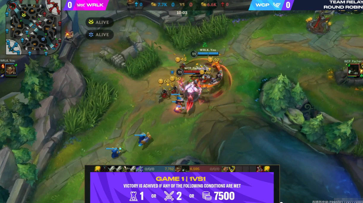 第一局SOLO赛,WCP这边派出了Pacheco,WRLK则是再次派出了You。Pacheco选择了狼人,You则是选择了鳄鱼。前三分钟对线,双方可以说是不相上下,但是3分钟之后,场上的局面开始变化,You打的非常凶悍,更是经常把Pacheco的狼人消耗回家,自己则是迅速积累经济。而之后有趣的是,WCP的选手眼看已经没有办法赢下比赛,便一直在发表情与You选手互动。最终,You则是以7500的经济拿下了第一局比赛的胜利。