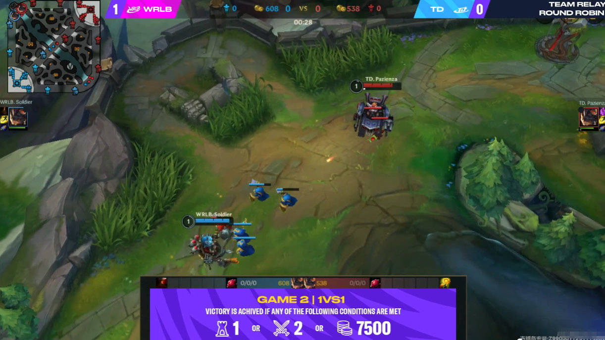 这局SOLO赛,WRLB派出了Soldier并选择了兰博,TD这边则是派出了Pazienza选手并同样选择了兰博。相同英雄SOLO,比拼的自然就是细节与熟练度了。而从对线刚开始,就可以明显感受到Soldier对细节的把控以及熟练度更高。虽然比赛时间来到5分钟左右,双方依旧没爆发“人头”,但Soldier则已经领先了Pazienza近800的经济。不过,与第一局不同的是,Pazienza并没有选择与Soldier硬刚,而Soldier则是以率先获取7500经济的方式赢下了这局SOLO赛的胜利。