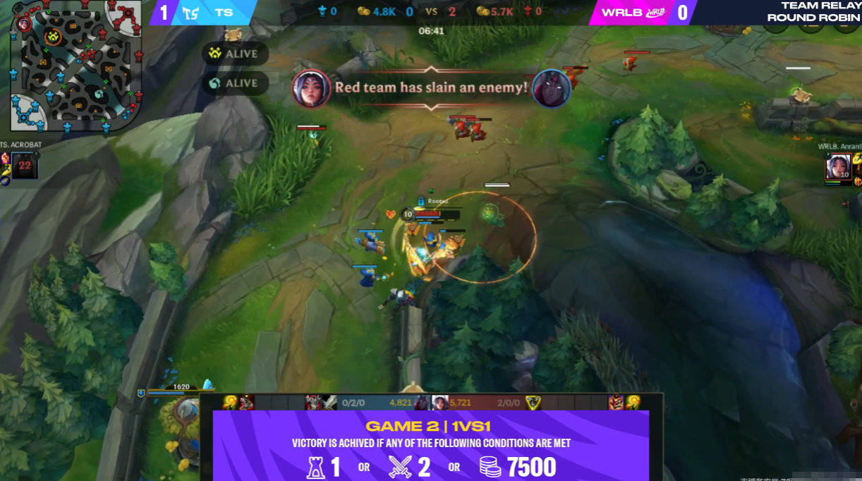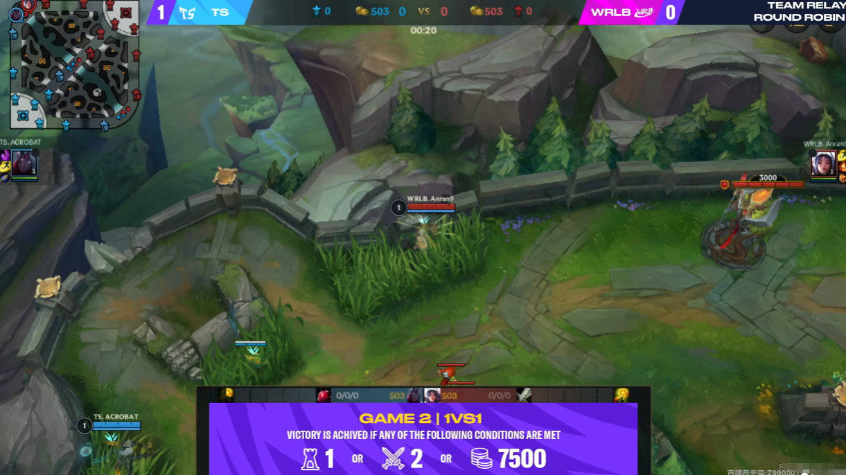 第二局比赛,TS派出了ACROBAT,他选择了韦鲁斯;WRLB则是派出了Anran9,他拿出了刀妹。虽然ACROBAT凭借着韦鲁斯的手长,前期取得了一定的经济优势。但随着刀妹的等级起来,比赛时间来到5分钟左右,Anran9果断出手,一套行云流水的操作,拿到“一血”。拿到“一血”后,刚刚复活并走到线上的ACROBAT走位出现失误,而Anran9也是抓住了这个机会,再次完成“击杀”。最终,凭借着两次“击杀”,Anran9帮助队伍扳回一城,拿下了这局比赛的胜利。