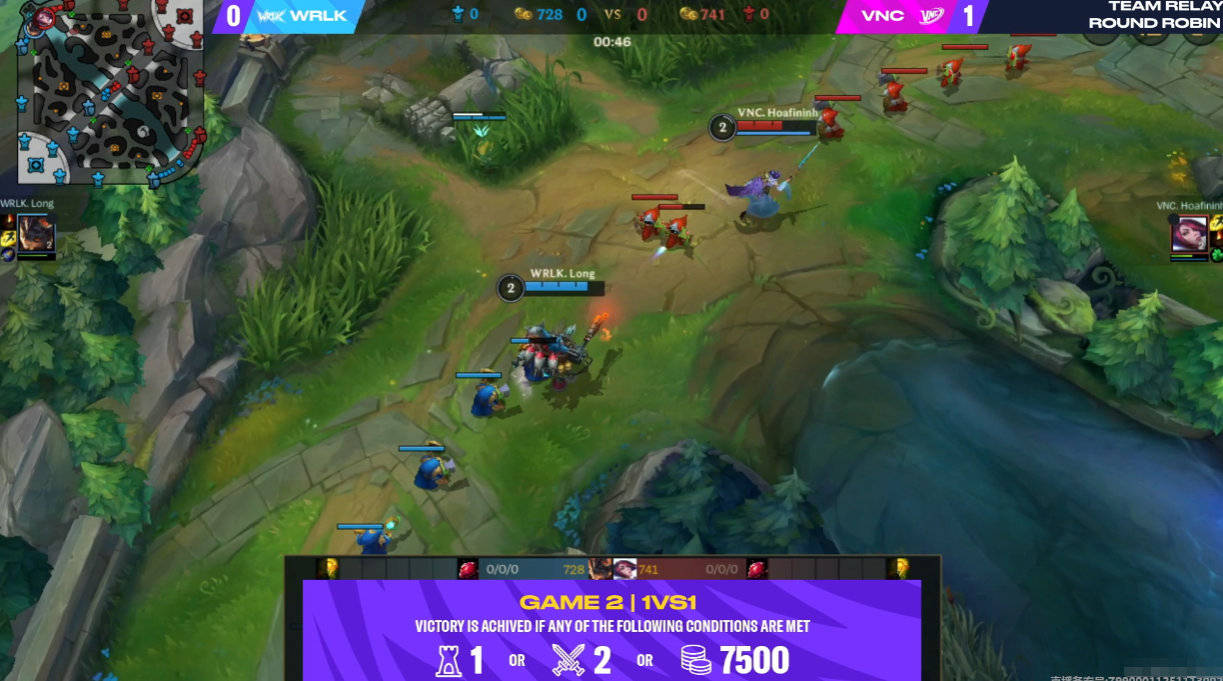 第二局比赛,VNC派出了Hoafininh,他选择了剑姬;WRLK派出了Long,选择了兰博。比赛开始没多久,就能够感受到Long兰博的熟练度非常高,不仅操作非常细腻,细节把控也很出色。在3分钟左右的时候,Long就利用对手的失误拿到了“一血”,而在拿到“一血”之后,Long并没有给到Hoafininh机会,凭借着等级与装备的优势,完成越塔“击杀”,成功拿下这局比赛的胜利,WRLK扳回一城。
