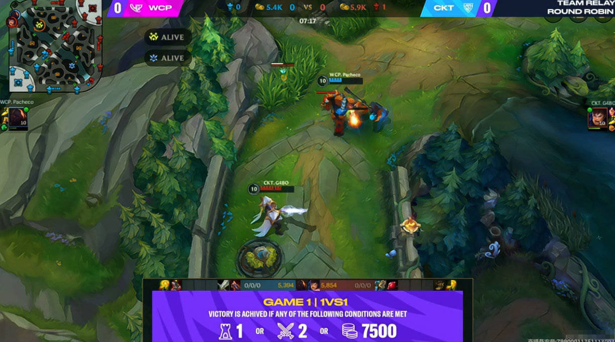 CKT这边派出了G4BO,WCP则是派出了Pacheco。他们分别拿出了盖伦与奥恩。这局比赛刚开始就出现了有趣的一幕,两名选手不约而同选择断对方的兵线。而这种情况一直持续了5分多钟。G4BO的盖伦出了破舰者这个关键的装备,对Pacheco的防御塔造成了很大的威胁。在这样的情况下,Pacheco不得不选择守塔。但此时,防御塔机制已经消失,G4BO的盖伦对防御塔的攻击也已经非常大。最终,Pacheco防守失败,G4BO成功以拆掉一塔的方式赢下了这局比赛的胜利。