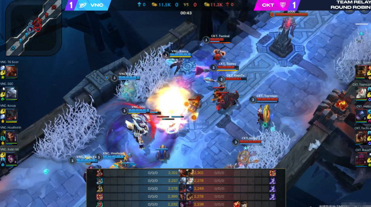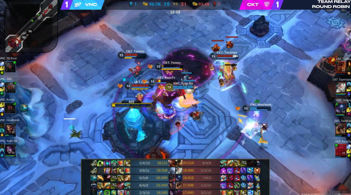 VNC对阵CKT的比赛与上一场比赛是同时进行的。双方在SOLO赛1比1的情况下进行了关键的符文大乱斗比赛。这场比赛,VNC选出了酒桶、狗熊、剑魔、德莱文以及莫甘娜;CKT则拿出了阿克尚、时光、贾克斯、炸弹人以及奥恩。