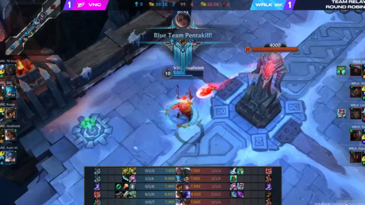 VNC拿出了腕豪、格温、炸弹人、莎弥拉与琴女;WRLK拿出了赛娜、赵信、莉莉娅、瑞兹以及石头人。比赛前期,双方其实还是你来我往的局面,但是3分钟左右的时候,局面突变,VNC这边的卡莎开出完美的大招,直接是收获到了“五杀”。在这波“五杀”过后,WRLK彻底陷入了劣势。虽说后续比赛WRLK不断寻找机会,但奈何没有办法威胁到发育太超前的莎弥拉。最终,VNC在莎弥拉的带领下成功击败了WRLK,VNC以3-1的总比分成功赢下了这轮比赛。