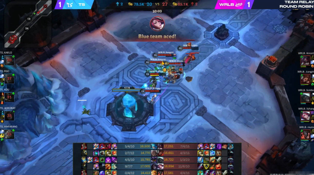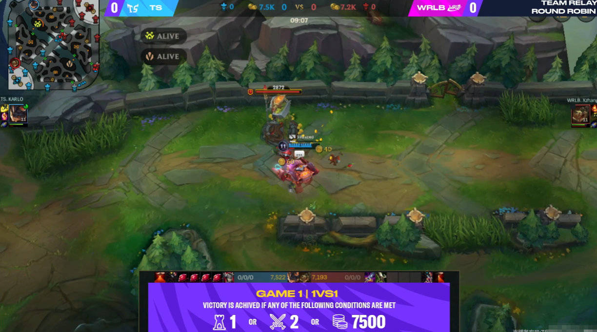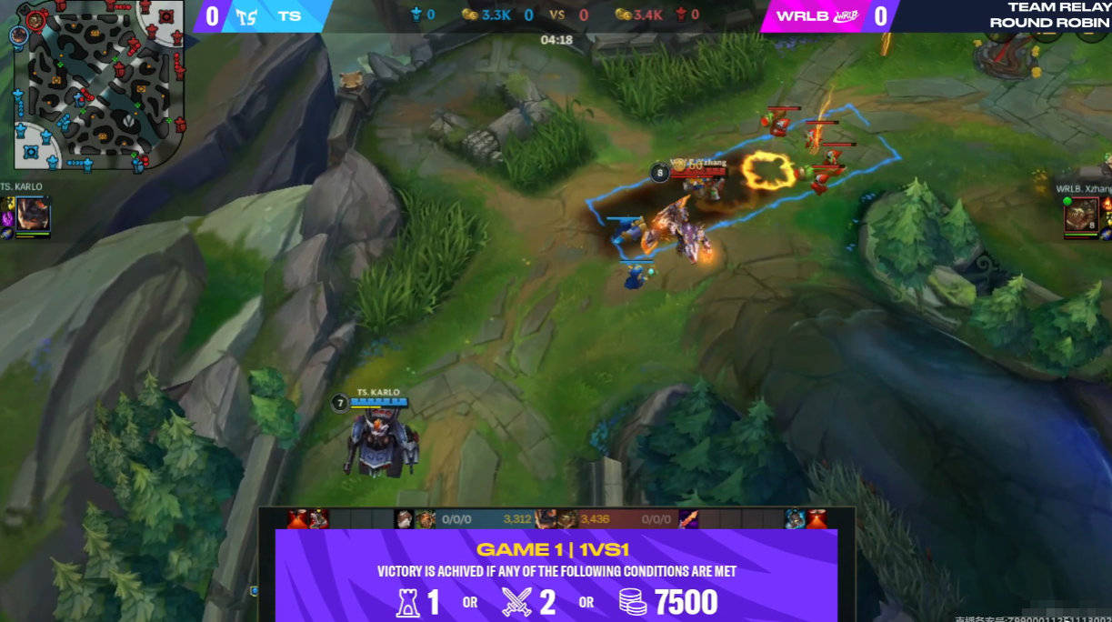 TS这边派出了KARLO,WRLB则是派出了Xzhang。KARLO选择了兰博,Xzhang则再次拿出了自己的招牌鳄鱼。或许是见识到了Xzhang鳄鱼的厉害,这局比赛KARLO选手并没有选择与Xzhang硬刚,反倒是选择了发育的打法。拥有大招之后的兰博,清兵能力要比鳄鱼更强。虽然Xzhang已经采用了断兵线的方式,想要赶超经济,但KARLO的兰博显然更胜一筹。最终,KARLO凭借着7500的经济拿下了第一局比赛的胜利。