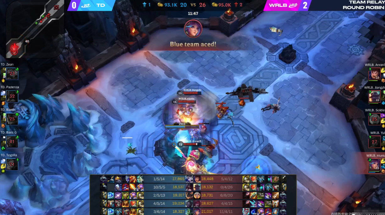 第三局比赛又是大家喜闻乐见的符文大乱斗模式了,TD这边选到了寒冰、阿卡丽、兰博、蒙多以及阿木木;WRLB这边则是拿到了盖伦、布隆、天使、霞以及莉莉娅。从阵容来看,明显是WRLB这种双坦克三C的阵容更好一些。