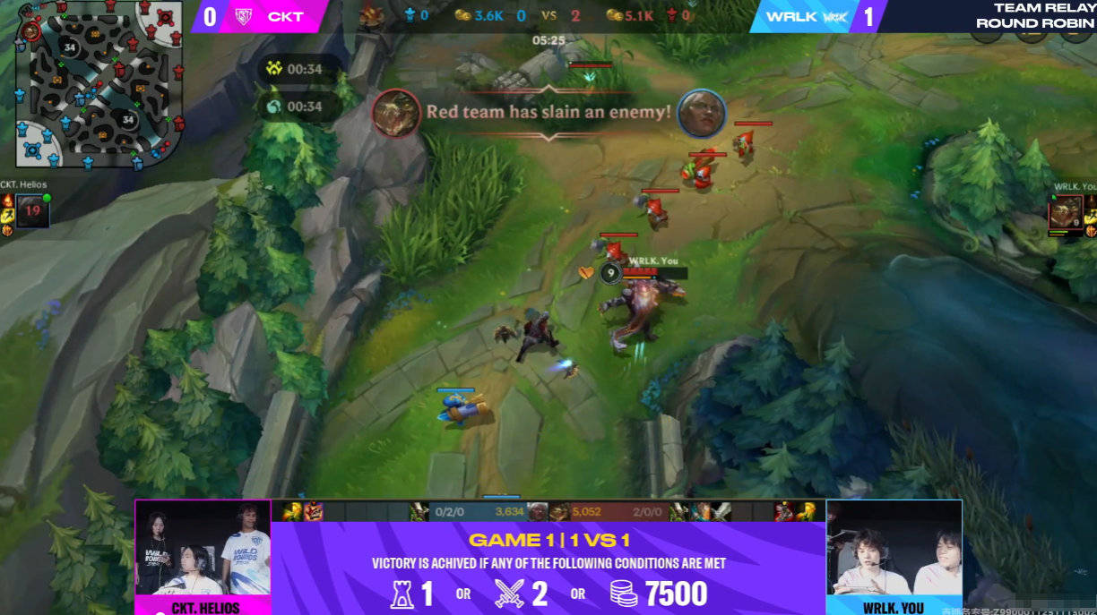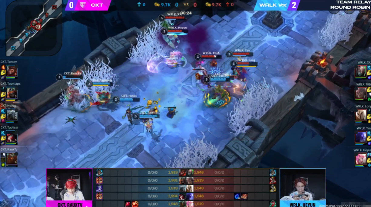 而在SOLO赛过后,就是CKT与WRLK的符文大乱斗。这局比赛CKT选到了猴子、劫、维克托、女枪以及泰坦;WRLK则是选到了炼金、腕豪、天使、瑞兹以及萨勒芬妮。从阵容上来看,明显还是CKT前期的爆发力更高,不过WRLK这边却拥有着很强的中后期团战能力。
