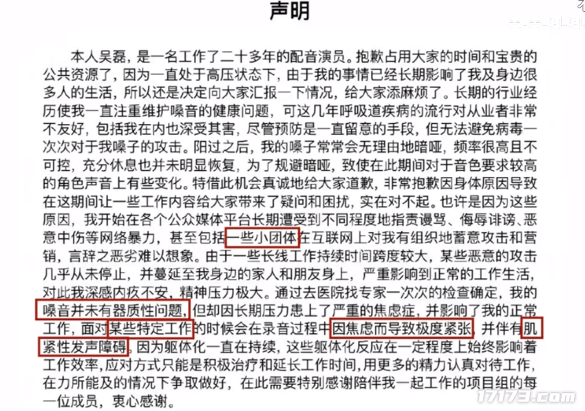 吴磊曾在声明中解释,自己嗓音并无器质性损伤,但在录制乙游内容时,会出现“躯体化反应”,即心理压力通过身体症状表现出来。