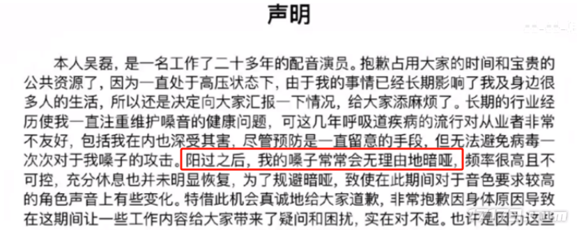 不过,这场“声音崩坏”并非今年才发生,早在2022年,就有零星吐槽出现。吴磊曾解释过,自己在阳了后,嗓子常常会无理由地暗哑,频率很高且不可控,因此对音色要求较高的角色声音上有些变化。