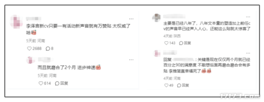 《恋与制作人》在李泽言换CV时,直接开启全网投票,让玩家从四个声音样本中自主选择。初期虽有人纠结“选2还是选3”,结果新CV上线后,因兼具两种特质被戏称为“2.5老师”,反而收获广泛认可。即便旧版声音已刻进DNA,新版依然快速赢得掌声,可见换CV之路并非走不通。