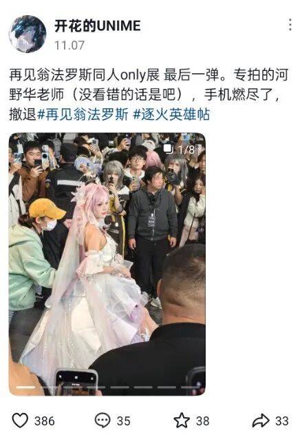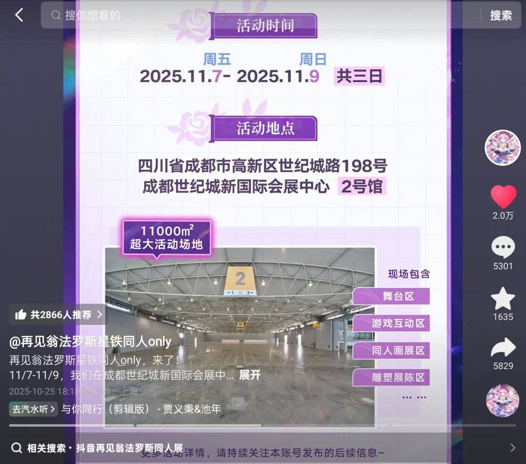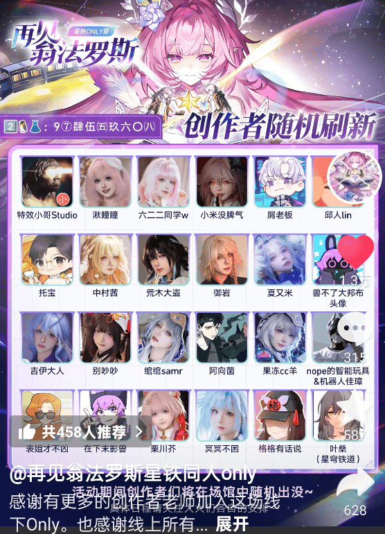但这些实打实的困难,没有断绝创作者们的热情。他们决定把接力的最后一棒交给抖音,借助后者更多的资源,以及对更多创作者和用户的影响力。最终在距离接龙结束还有5天的时候,「再见翁法罗斯」星铁同人Only展在抖音上建立了自己的账号,并宣布正式定档11月7日-9日。