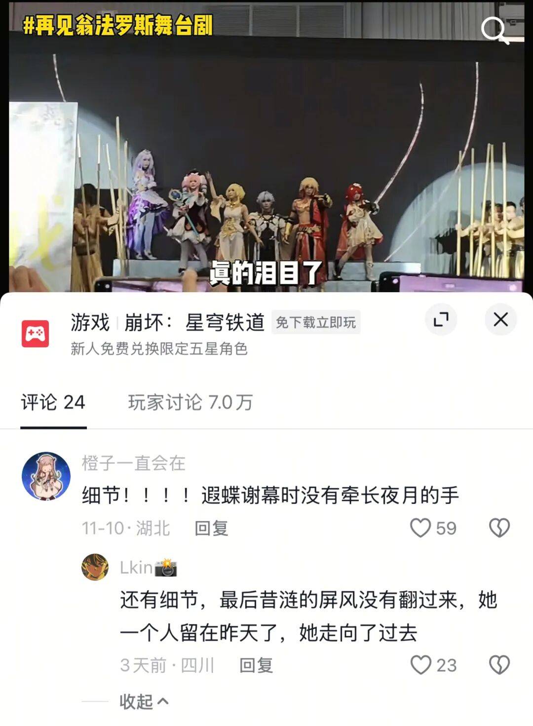 幸运的是,他们的创作也深深地打动了不少人。在演出结束后,玩家们的欢呼和掌声不绝于耳,后来还有博主在抖音上发布观后感时说,光是舞台剧的音乐一响,TA就忍不住“泪目”了。还有不少玩家在舞台剧中发现了很多贴合游戏剧情的微小细节,并对此佩服不已。
