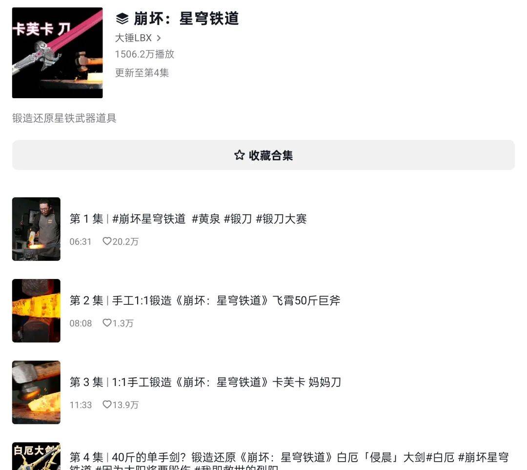 创作者@大锤LBX在接触星铁之前,是一名热爱单机游戏的玩家,已经至少在「同人武器」这个领域钻研了3年以上。但自从了解星铁后,他的作品就转为了卡芙卡和黄泉的刀、白厄的大剑、昔涟的弓……他还专门给自己还原的星铁武器做了个合集,对游戏的热爱一目了然。