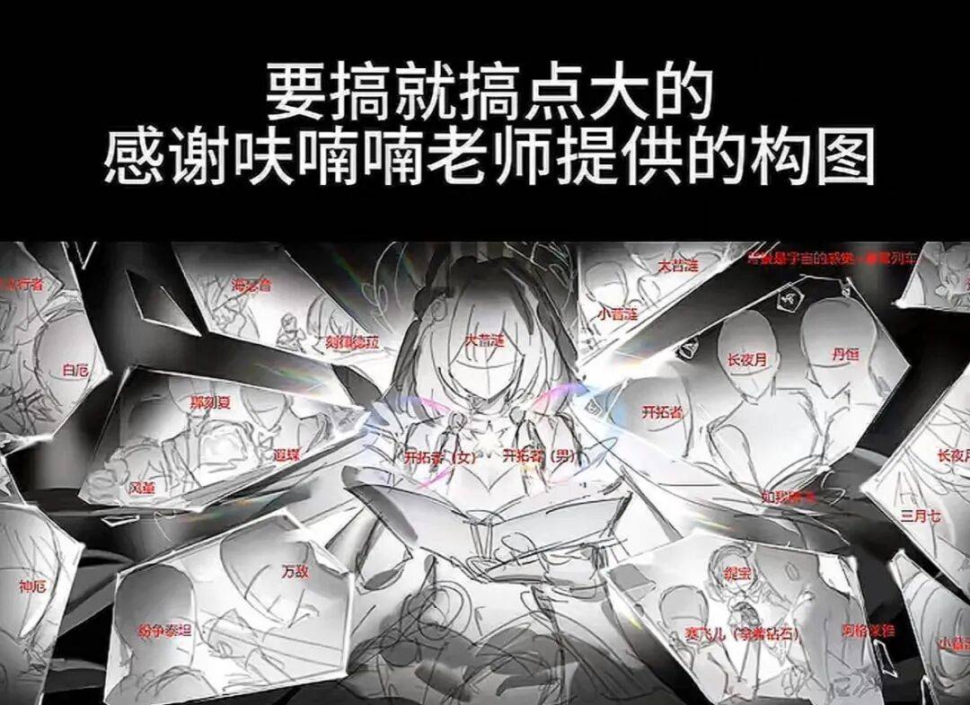 另一名发起人@呋喃喃,也是一个生动的例子。这场接龙之所以能做得如此之大,显然和她最初的草图脱不开干系。假如不是早已对翁法罗斯的故事了熟于心,我想,她也不会画出这样一张能够包含23名角色,并且每名角色都有着独特站位的构图。
