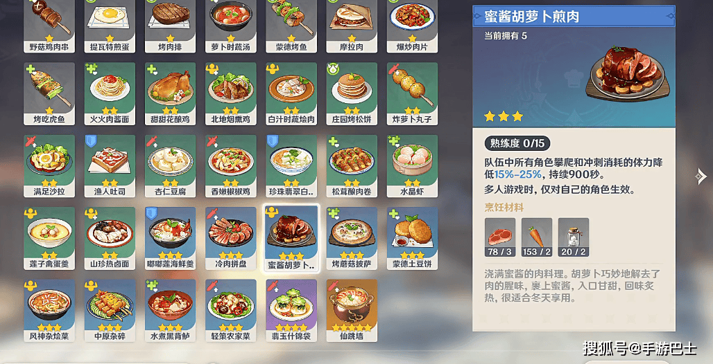 兑换到菜谱后,打开背包,在“道具”栏的“食谱”分类中找到它,点击“学习”就能永久解锁该料理的制作权限。之后去任何一个有厨房的地方(比如蒙德的猎鹿人餐厅、璃月的新月轩,或者自己尘歌壶里的厨房),消耗3个胡萝卜、2块兽肉和1份糖,就能制作出密酱胡萝卜煎肉啦。