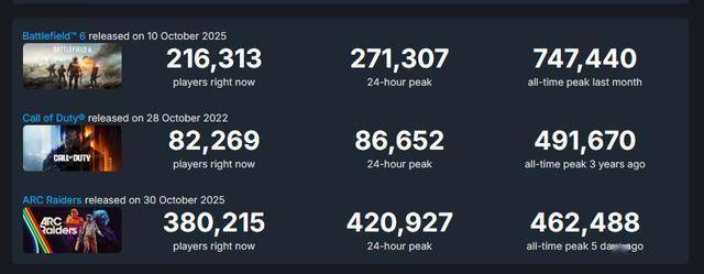 《黑色行动7》首发在线峰值仅8.6万人,远不及《战地6》和近期的《Arc Raiders》
