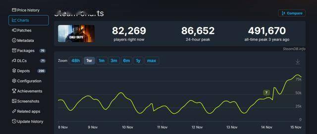 根据SteamDB的数据,《使命召唤22:黑色行动7》的发售导致《使命召唤》系列游戏同时在线玩家峰值只有约8.4万人。相比之下,2024年10月《使命召唤21:黑色行动6》首发时,这一数字曾高达30.6万人。