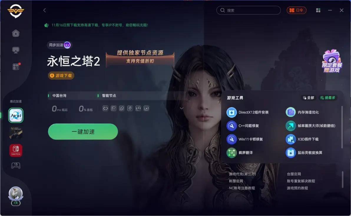 首先在你的电脑上安装QY网络优化软件,在搜索栏搜索《永恒之塔2》后点击一键加速,在这个页面你可以看到QY为了优化《永恒之塔2》的网络问题做出了多项的功能调整