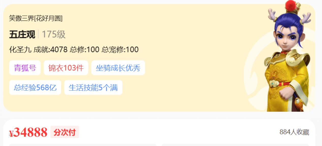 这个角色为人修宠修全满25级的175化圣五庄观,拥有103件锦衣,其中最亮眼的正是青花瓷与九尾冰狐的穿搭组合。更引人注目的是,其摆价仅为3.48万元,远低于当前市场行情,无论谁最终中签,都可谓是一次赚大钱的捡漏。