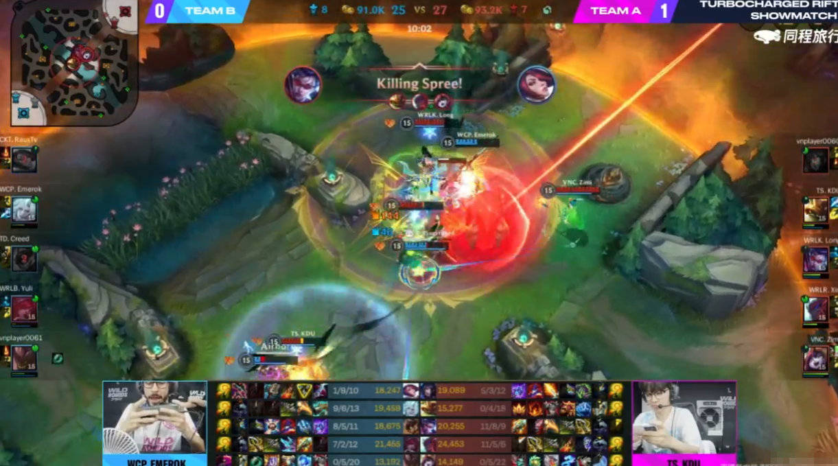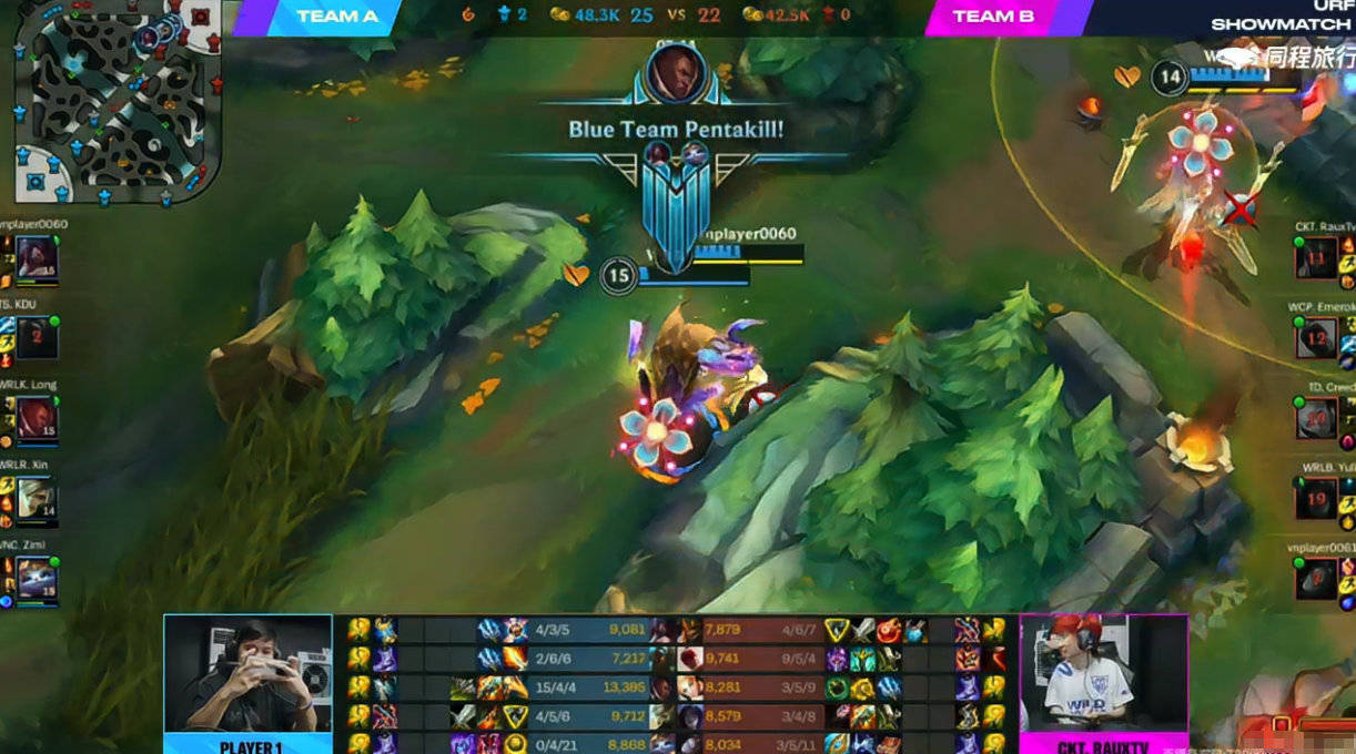众所周知,无限火力团战固然重要,但更多的是看选手的个人操作。所以这场比赛短短2分钟就已经爆发了10个“人头”。特别是盲僧,表现非常亮眼。而操控阿卡丽的路人表现也同样精彩,操作非常行云流水。比赛来到中期,逐渐发育起来的卢锡安戴着悠米开始掌控比赛,期间更是打出了一波精彩的“五杀”。