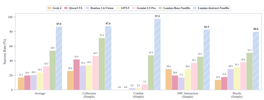 论文进一步指出,Lumine是目前唯一能在3D开放世界中完成数小时任务的AI智能体。在四项关键测试中,其特定版本「Lumine-Instruct-NonHis」的成功率均超过80%,性能显著优于GPT-5、Gemini 2.5 Pro、Grok-4、Qwen3-VL等主流大模型及其它基线方法。