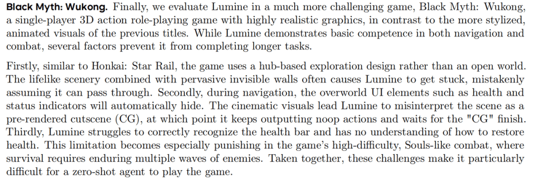 此外,尽管Lumine主要使用《原神》数据进行训练,但其目标却是打造通用型智能体。论文显示,团队也将Lumine的实测范围扩展至《鸣潮》《崩坏:星穹铁道》乃至《黑神话:悟空》,并取得了不错的结果: