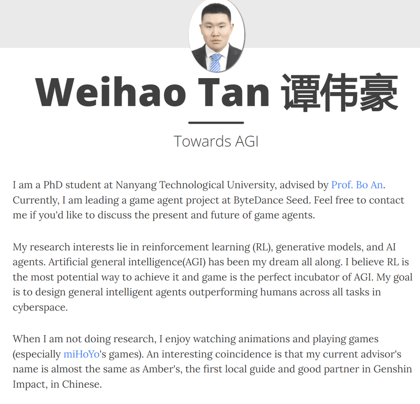 Lumine项目的负责人及论文主要作者谭伟豪,是南洋理工大学博士生。他在个人主页上表示自己很喜欢米哈游的游戏,巧的是,他的博士导师也叫「安柏」——与《原神》开篇的引路人安柏的中文名相似。
