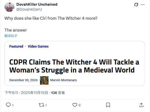 玩家:她为什么更喜欢《巫师4》中的希里,原因在于CDPR此前曾表示《巫师4》将探索一名女性在中世纪世界艰难求生的处境