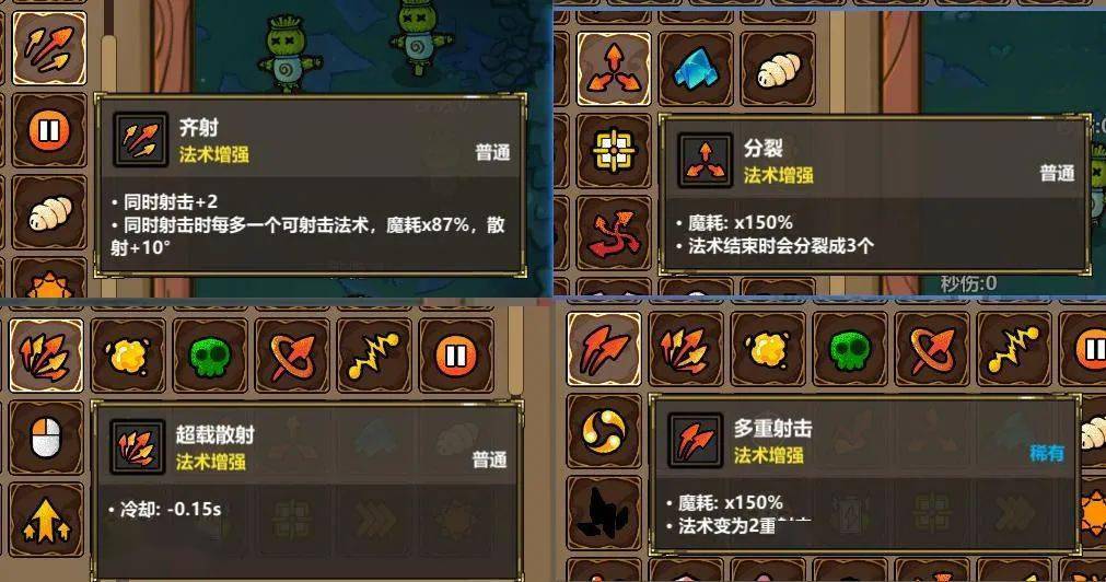 游戏内的法术模块种类丰富,除了能直接改变攻击特效的释放类法术,还有大量带有辅助特效的增强类法术。有的能改变法术范围,有的能改变子弹数量,有的能减少法术CD,还有的能让法术附带中毒或者冰冻特效。